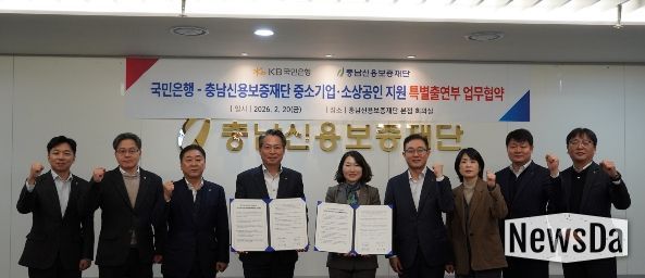 뉴스다 최광묵 기자 | 충남신용보증재단은 2월 20일 충남경제 활력 제고와 지역 중소기업·소상공인의 경영안정 지원을 위해 KB국민은행과 '중소기업·소상공인 금융지원 특별출연 업무협약'을 체결하고, 총 525억 원 규모의 신용보증 지원에 나섰다.