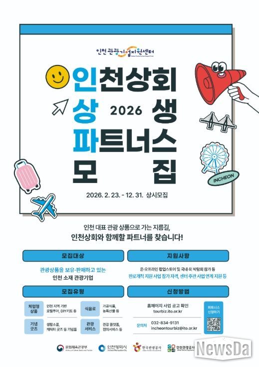 뉴스다 최광묵 기자 | 인천광역시와 인천관광공사는 인천관광기업지원센터에서 인천의 우수한 관광 상품 발굴 및 지속 가능한 판로개척 지원을 위한 ‘2026년 인천상회 상생 파트너스’를 2월 23일부터 12월 31일까지 상시 모집한다고 밝혔다.