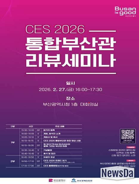 뉴스다 최광묵 기자 | 부산시는 오늘(27일) 오후 4시 시청 대회의실에서 'CES 2026 통합부산관' 리뷰 세미나를 개최한다고 밝혔다.