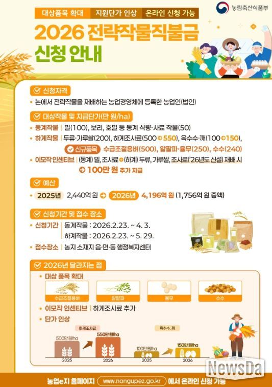 하계작물은 식용 옥수수와 깨 150만원, 두류와 가루쌀 200만원, 수수 240만원, 알팔파와 율무 250만원, 수급조절용 벼 500만원, 조사료 550만원이 각각 지급된다.