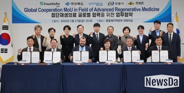 뉴스다 최광묵 기자 | 포항시는 27일 경상북도 동부청사에서 경상북도, 안동시, 의성군과 함께 독일 프라운호퍼 생체의공학 연구소(IBMT)와 ‘첨단재생의료산업 육성을 위한 공동 협력 양해각서(MOU)’를 체결했다.