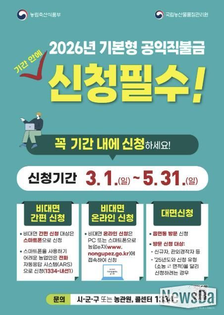 뉴스다 최광묵 기자 | 시흥시는 5월 31일까지 ‘2026년 기본형 공익직불금’ 신청을 받는다고 5일 밝혔다.