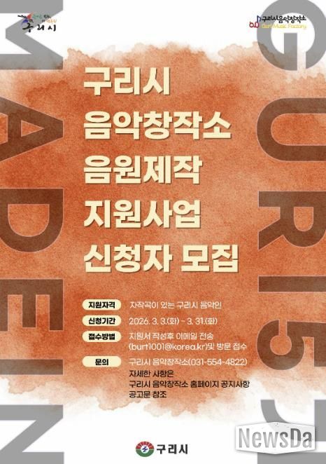 뉴스다 최광묵 기자 | 구리시는 3월부터 추진하는 구리시 음악창작소 지역 아마추어 음악가 음원 제작 지원사업 '2026 Made in Guri(메이드 인 구리)’참여자를 모집한다고 밝혔다.