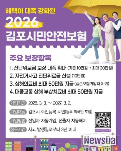 뉴스다 최광묵 기자 | 김포시는 3월 3일부터 시민들이 일상생활 중 겪을 수 있는 불의의 사고에 대비해 보장 항목을 강화한 ‘2026년 김포시민안전보험’을 시행한다고 밝혔다.