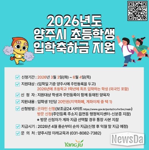 뉴스다 최광묵 기자 | 양주시가 지역 내 초등학교 1학년에 입학하는 신입생 가정의 교육비 부담을 경감하고 교육복지 실현을 위해 ‘2026년 초등학교 입학축하금 지원사업’을 추진한다.