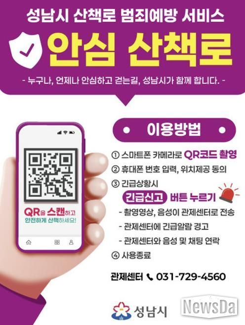뉴스다 최광묵 기자 | 성남시는 시민들이 보다 안심하고 산책로를 이용할 수 있도록 영장산과 불곡산 일대 산책로에 ‘범죄예방 서비스’를 6일부터 도입한다.
