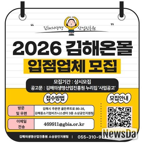 한편, 입점 신청은 김해의생명산업진흥원 누리집 ‘사업공고’를 통해 확인 가능하며, 자세한 사항은 진흥원 소상공인지원팀으로 문의하면 된다.