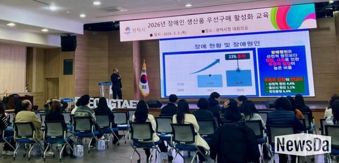 뉴스다 최광묵 기자 | 평택시는 지난 5일 시청 본관 2층 대회의실에서 평택시 공무원을 대상으로 '2026년 장애인생산품 우선구매 활성화 교육’을 실시했다.