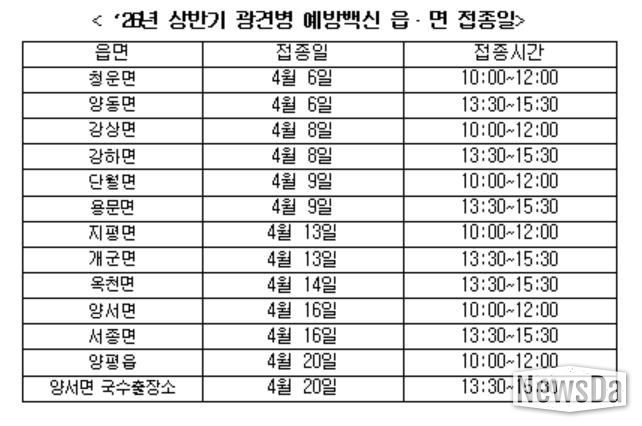 뉴스다 최광묵 기자 | 양평군은 오는 4월 6일부터 4월 24일까지 광견병 예방접종을 실시한다고 밝혔다.