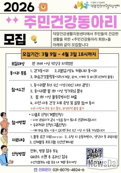 뉴스다 최광묵 기자 | 고양특례시 덕양건강생활지원센터가 지역주민이 주도하는 건강 행복 도시조성을 위해 ‘주민건강동아리’참여자를 모집한다.