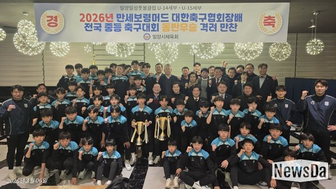 뉴스다 류대현 기자 | 밀양시체육회는 지난 6일 밀양아리나호텔에서 ‘2026 만세보령머드 대한축구협회장배 전국 중등 축구대회’에서 동반 우승을 차지한 밀양·밀성풋볼 스포츠클럽(U-15, U-14) 선수단을 격려하기 위한 축하 만찬을 개최했다고 밝혔다.