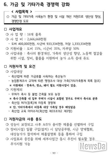 ‘가금 및 기타가축 사육농가 지원사업’은 시설 현대화를 통한 축사 환경 개선, 방역 물품 지원 등을 통한 생산성 향상이 주요 내용이다.