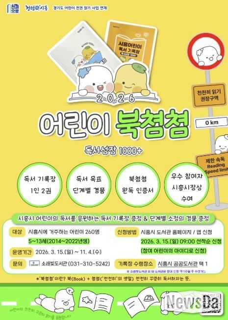 뉴스다 최광묵 기자 | 시흥시 소래빛도서관은 오는 3월 15일부터 관내 5~13세 어린이 260명을 대상으로 독서 기록장을 배부하고, 우수 참여자 8명에게 시흥시장상을 수여하는 독서사업 ‘2026 어린이 북쳠쳠 독서성장 1000+’를 운영한다.