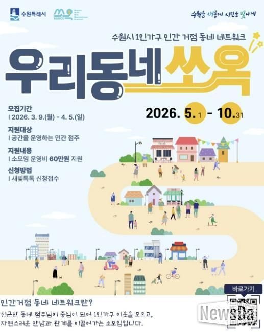수원시 관계자는 “우리동네 쏘옥은 시민들이 자주 찾는 동네 공간을 소통 거점으로 활용해 1인가구가 자연스럽게 관계를 이어갈 수 있도록 돕는 사업”이라며 “민간 공간 운영자들의 많은 관심과 참여를 바란다”고 말했다.