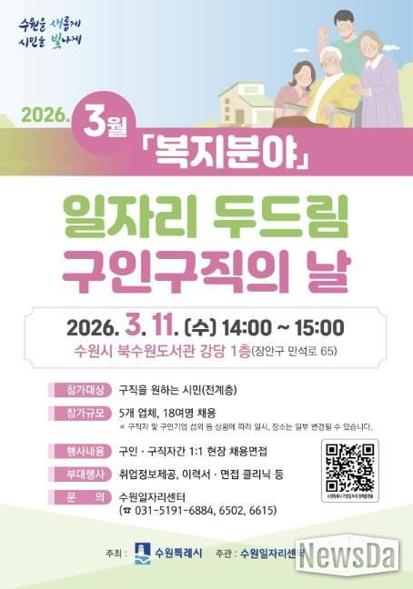 뉴스다 최광묵 기자 | 수원특례시는 3월 11일 오후 2시부터 3시까지 북수원도서관 강당에서 ‘3월 일자리 두드림 구인·구직의 날’을 개최한다.