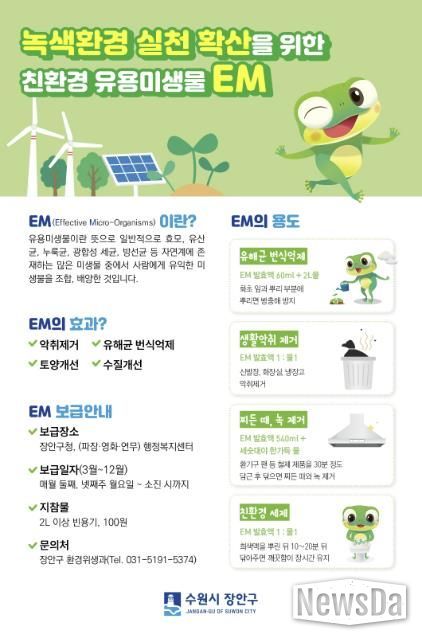 수원시 장안구 관계자는 “2026년에도 시민들의 많은 관심과 참여를 부탁드린다”며 “EM 보급을 통해 시민들이 일상 속에서 친환경 생활을 실천하는 데 도움이 되길 기대한다”고 말했다.