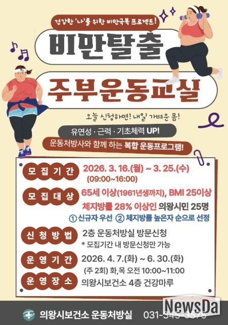 뉴스다 최광묵 기자 | 의왕시 보건소는 오는 3월 16일부터 3월 25일까지 “건강한 나를 위한 비만 극복 프로젝트 '비만 탈출 주부 운동 교실'” 참여자 25명을 모집한다.