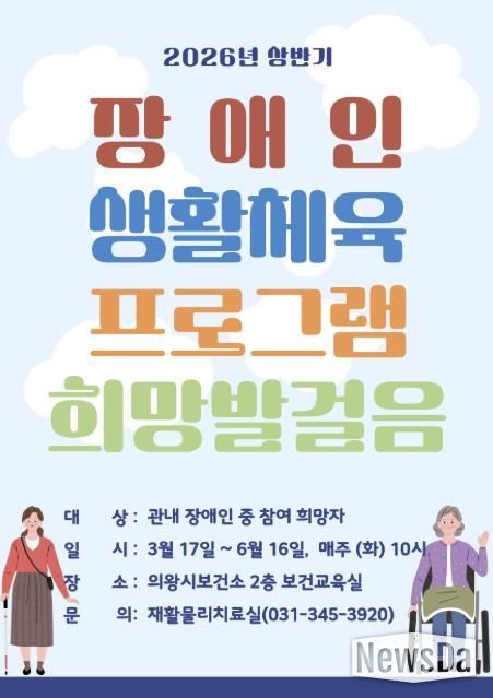 뉴스다 최광묵 기자 | 의왕시 보건소가 지역 내 장애인의 건강관리 및 재활 의지 향상을 위해 운영되는 2026년 상반기 장애인 생활체육 프로그램 '희망발걸음'의 참여자를 모집한다.