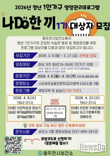 뉴스다 최광묵 기자 | 동두천시 보건소는 청년 1인 가구를 위한 맞춤형 영양 관리 프로그램 ‘나DO한끼’ 1기를 운영한다고 밝혔다.