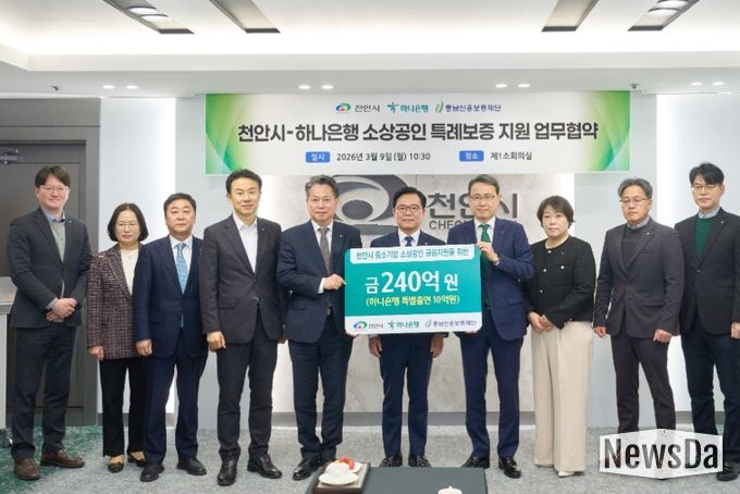 천안시는 9일 하나은행, 충남신용보증재단과 ‘2026 소상공인 특례보증 업무협약’을 체결했다.