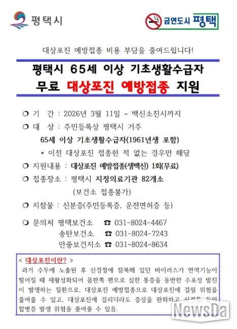 뉴스다 최광묵 기자 | 평택시는 65세 이상 취약계층 어르신의 건강증진과 예방접종 비용 부담 완화를 위해 ‘대상포진 예방접종을 연중 무료로 지원’한다고 밝혔다.