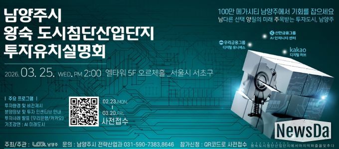 뉴스다 최광묵 기자 | 남양주시는 오는 25일 서울 서초구 엘타워에서 ‘왕숙 도시첨단산업단지 투자유치설명회’를 개최하고, 첨단산업 투자거점으로 급부상하는 시의 투자환경을 기업에 소개한다고 밝혔다.