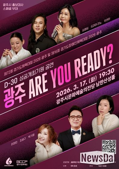 뉴스다 최광묵 기자 | 광주시문화재단은 오는 3월 17일 오후 7시 30분, 광주시문화예술의전당 남한산성홀에서 ‘제72회 경기도체육대회 2026 광주 및 제16회 경기도장애인체육대회 2026 광주 D-30 성공기원 공연’ '광주! ARE YOU READY?'’를 개최한다.