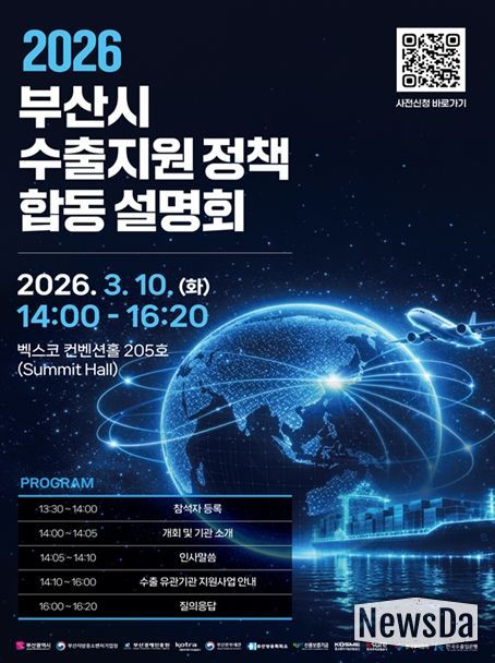 뉴스다 최광묵 기자 | 부산시는 오늘(10일) 오후 2시 벡스코(BEXCO) 컨벤션홀 205호에서 '2026 부산 수출지원정책 합동설명회'를 개최한다고 밝혔다.