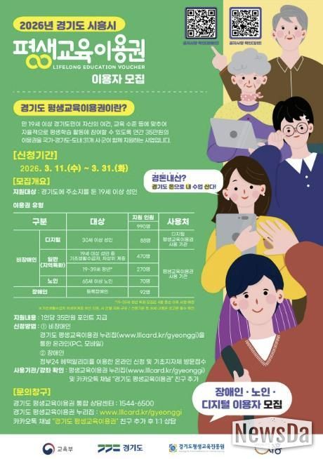 뉴스다 최광묵 기자 | 시흥시는 시민들의 평생학습 기회를 확대하기 위해 ‘2026년 제1차 경기도 평생교육이용권’ 신청을 오는 3월 11일 오전 10시부터 3월 31일 오후 6시까지 받는다.