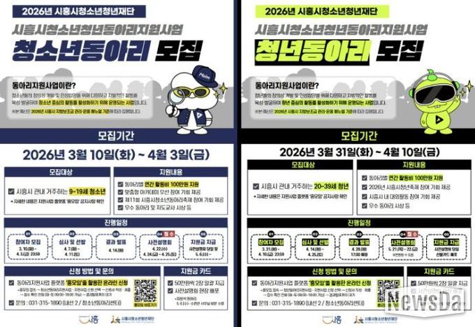 뉴스다 최광묵 기자 | 시흥시와 시흥시청소년청년재단은 지역 청소년과 청년의 자율적인 동아리 활동을 지원하고 건강한 문화 형성을 위해 ‘2026년 시흥시 청소년ㆍ청년 동아리 지원사업’에 참여할 동아리 670개를 모집한다고 밝혔다.