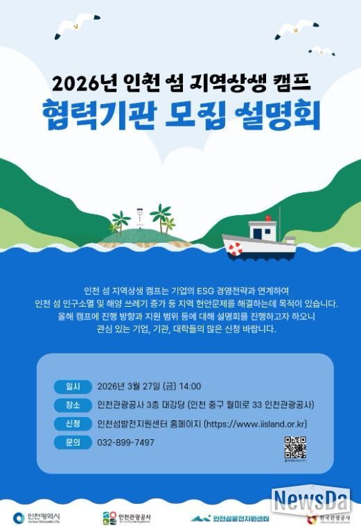 뉴스다 최광묵 기자 | 인천광역시와 인천관광공사는 기업·기관·대학의 ESG 실천과 인천 섬 지역 상생을 연계하기 위한'2026 인천 섬 지역상생 캠프'협력기관 모집 설명회를 3월 27일 오후 2시 상상플랫폼 3층에서 개최한다고 밝혔다.