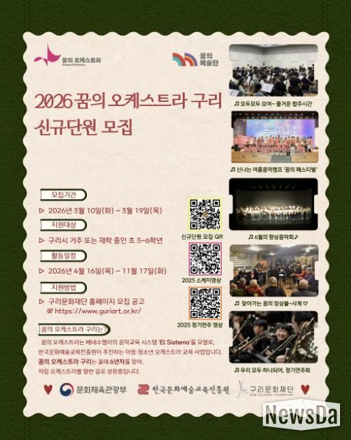 뉴스다 최광묵 기자 | (재)구리문화재단이 2026년 ‘꿈의 오케스트라 구리’에 함께할 신규 단원과 교육 강사를 공개 모집한다. 이번 모집을 통해 초등학교 3학년부터 6학년까지의 아동 약 10명과 분야별 교육 강사 13명을 선발할 예정이다.