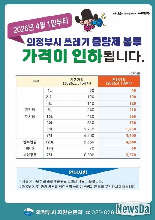 뉴스다 최광묵 기자 | 의정부시는 ‘의정부시 폐기물 관리 조례’ 개정에 따라 4월 1일부터 종량제 규격봉투 가격을 인하한다.