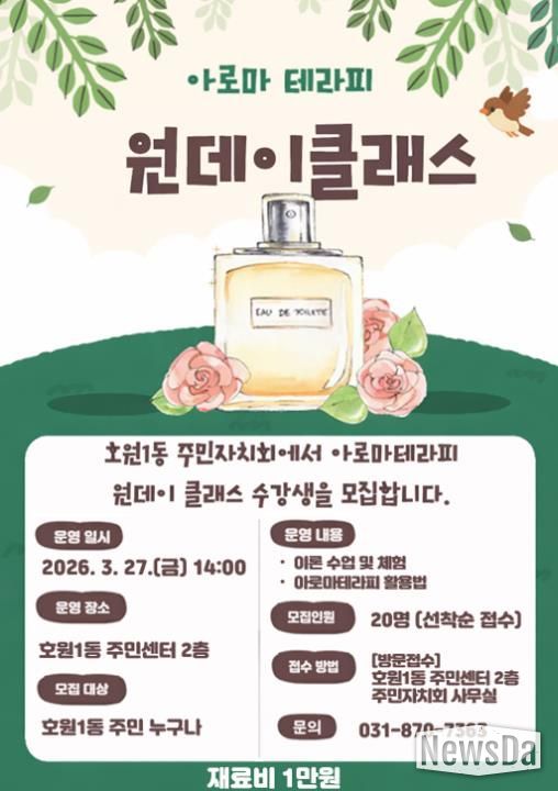 뉴스다 최광묵 기자 | 의정부시 호원1동주민센터는 호원1동 주민자치회와 함께 ‘숙면을 돕는 나만의 향 만들기, 아로마 테라피 원데이 클래스’를 운영하기 위해 수강생을 모집한다.