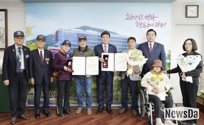 뉴스다 최광묵 기자 | 광주시는 지난 9일 6·25전쟁에 참전해 공을 세운 고 최광복 하사와 고 강창호 상사의 유가족에게 화랑무공훈장과 증서를 전달했다.
