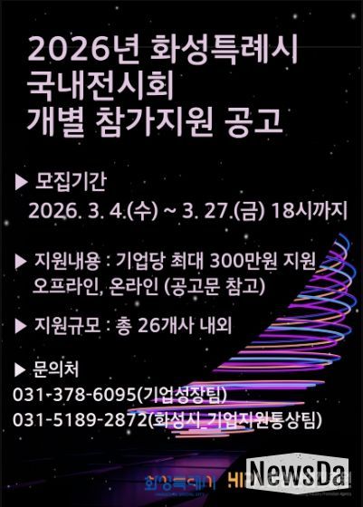 뉴스다 최광묵 기자 | 화성산업진흥원은 관내 중소기업의 국내 판로 확대와 브랜드 인지도 제고를 위해 ‘2026년 화성시 국내 전시회 개별참가 지원사업’을 추진하고, 참여기업 26개사를 모집한다고 밝혔다.