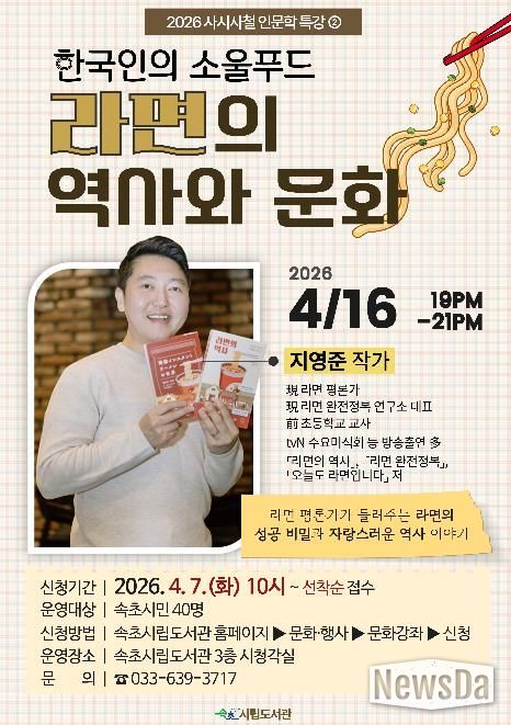 뉴스다 최광묵 기자 | 속초시립도서관은 4월 16일 19시 시청각실에서 속초시민 40여 명을 대상으로 사시사철 인문학 두 번째 프로그램 ‘한국인의 소울푸드, 라면의 역사와 문화’ 특강을 운영한다.