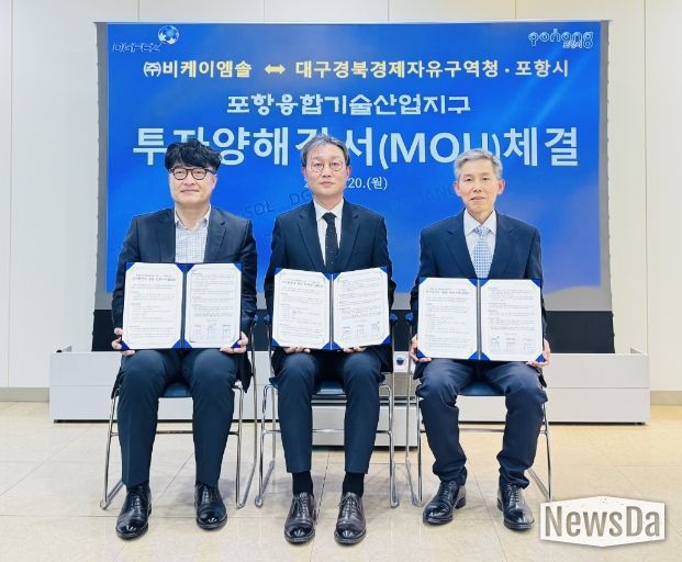 뉴스다 최광묵 기자 | 포항시와 대구경북경제자유구역청은 20일 ㈜비케이엠솔과 포항융합기술산업지구 내 투자 유치를 위한 양해각서(MOU)를 체결했다.