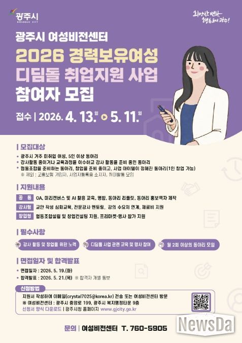 뉴스다 최광묵 기자 | 광주시는 지역 내 경력보유여성의 사회 재진출과 취업 역량 강화를 위해 ‘2026 경력보유여성 디딤돌 취업 지원 사업’ 참여자를 오는 5월 11일까지 모집한다고 22일 밝혔다.