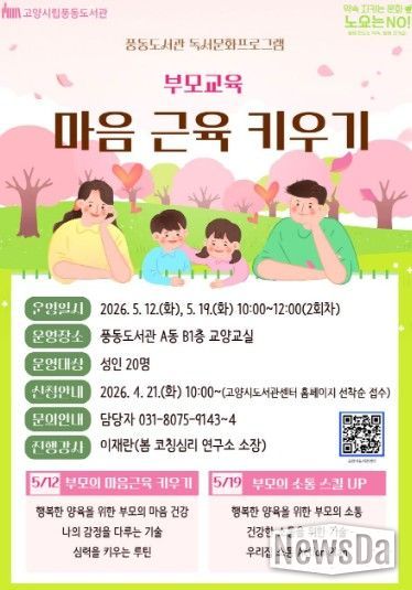 뉴스다 최광묵 기자 | 고양특례시 풍동도서관은 오는 5월 독서문화 프로그램 ‘부모교육, 마음 근육 키우기’를 진행한다고 22일 밝혔다.