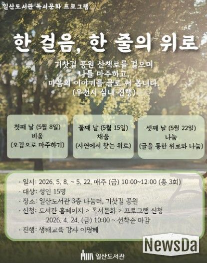 일산도서관 관계자는 “‘한 걸음, 한 줄의 위로’는 자연 속에서 천천히 걷고 글로 자신을 표현하는 과정을 통해 스스로를 돌보고 치유하는 프로그램”이라며, “참여자들이 서로의 이야기를 나누며 공감과 위로를 경험하는 시간이 되길 바란다”고 전했다.
