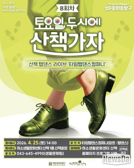 뉴스다 최광묵 기자 | 제천문화재단이 운영하는 하소생활문화센터 ‘산책’에서 매주 토요일 시민들과 함께하는 문화예술 프로그램 '토요일 두시에 산책가자'의 여덟 번째 무대로 ‘탭댄스 공연’을 선보인다.