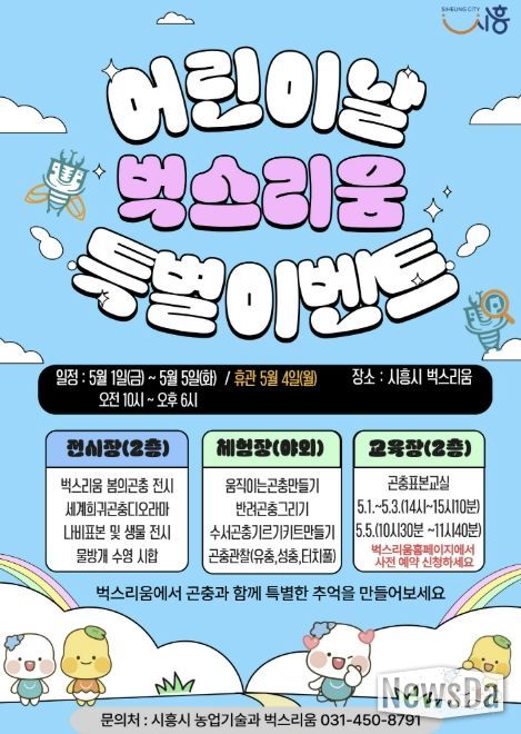 뉴스다 최광묵 기자 | 시흥시 곤충체험전시관 ‘벅스리움’은 어린이날을 맞아 아동과 가족이 함께 즐길 수 있는 ‘특별 프로그램’을 오는 5월 1일부터 5일까지 운영한다.
