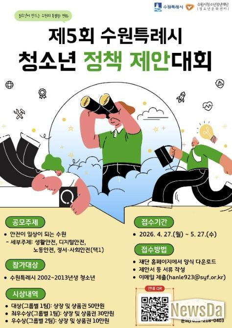 뉴스다 최광묵 기자 | 수원시청소년청년재단 수원청소년문화센터는 청소년이 정책을 기획하고 제안하는 ‘제5회 수원특례시 청소년 정책 제안대회’ 참가팀을 4월 27일부터 5월 27일까지 모집한다.