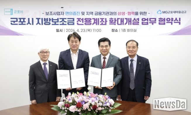 뉴스다 최광묵 기자 | 군포시는 지방보조금 전용계좌 개설 금융기관을 기존 시 금고인 NH농협은행에 더해 새마을금고까지 확대하기 위한 업무협약을 23일 체결했다고 밝혔다.