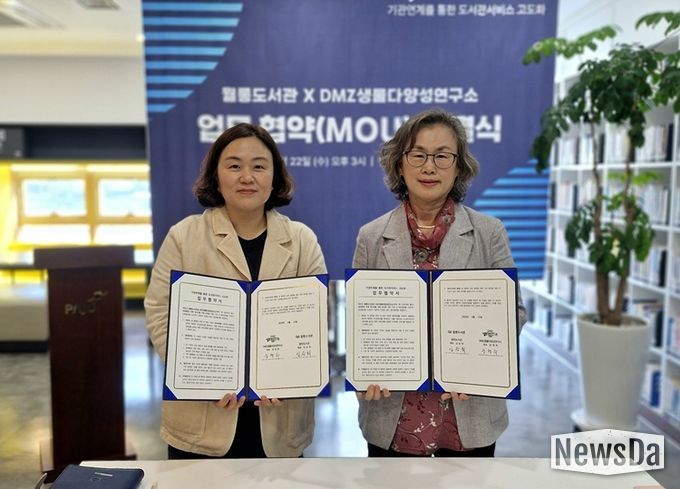 뉴스다 최광묵 기자 | 파주시 월롱도서관은 지난 22일 디엠지(DMZ)생물다양성연구소와 지역사회 독서진흥 및 생태환경 분야 협력을 위한 업무협약을 체결했다.