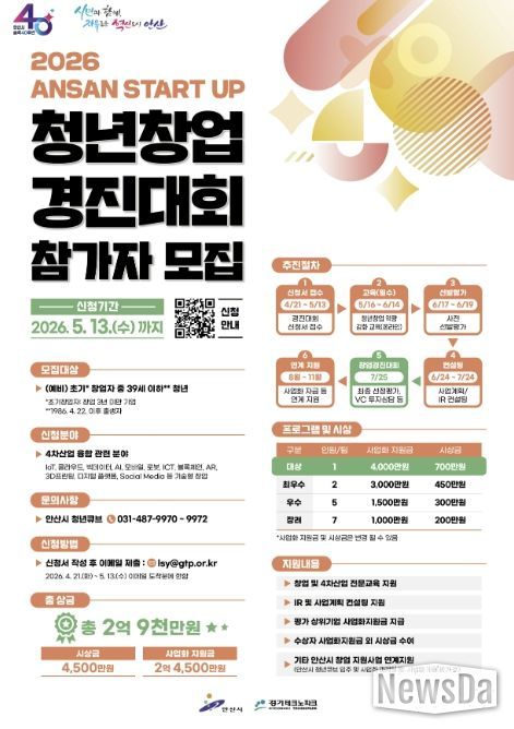뉴스다 최광묵 기자 | 안산시는 창의적인 아이디어를 보유한 청년 창업가를 발굴하기 위해 내달 13일까지 ‘2026 안산 스타트업 청년창업 경진대회’ 참가자를 모집한다고 24일 밝혔다.