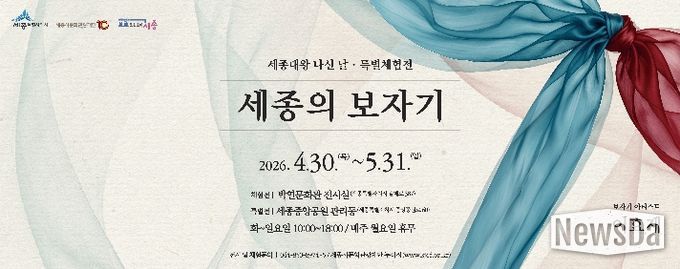 뉴스다 최광묵 기자 | (재)세종시문화관광재단은 제629돌 세종대왕 나신 날(5월 15일)을 기념하여 4월 30일부터 5월 31일까지 박연문화관 전시실과 세종중앙공원 관리동에서 특별체험전 ‘세종의 보자기’를 선보인다.