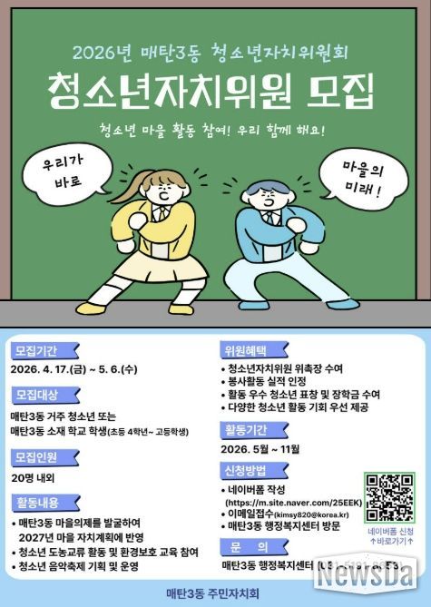 뉴스다 최광묵 기자 | 수원시 영통구 매탄3동은 매탄3동 주민자치회가 지역 청소년의 참여를 확대하고, 향후 지역사회를 이끌어 나갈 역량을 기르기 위해 2026년 청소년자치위원회 위원을 모집한다고 밝혔다.