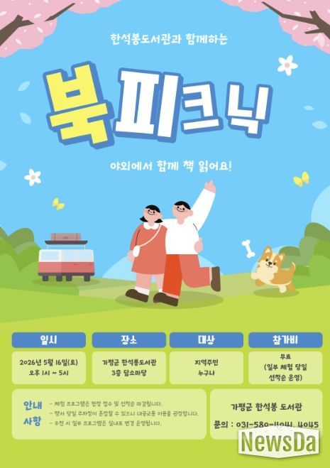 뉴스다 최광묵 기자 | 가평군은 5월 가정의 달을 맞아 오는 16일 한석봉도서관 3층 담소마당에서 ‘가족과 함께하는 북 피크닉’ 행사를 개최한다고 밝혔다.
